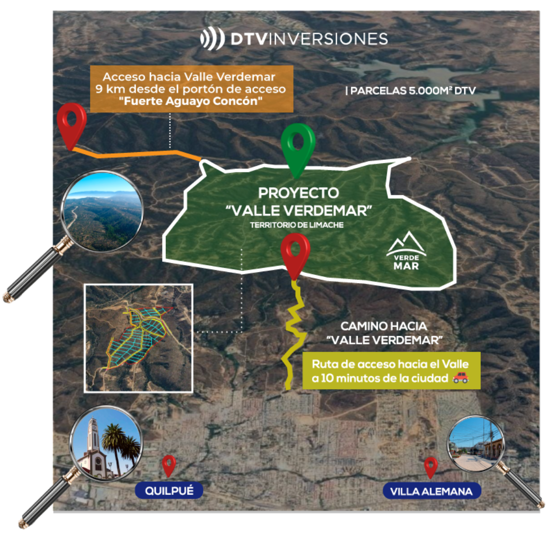 El proyecto TINGUIRIRICA, si bien se ubica en la comuna de Limache, cuenta con tres accesos estratégicos que facilitan su conectividad. El principal acceso se encuentra en Concón, a través del Fuerte Aguayo, a solo 4.5 km del proyecto (12 minutos en vehículo), con portería y acceso controlado. Luego, se puede acceder por calle Lincoyán en Quilpué (sector Belloto Norte), cercano a la estación de Metro Belloto, y por Villa Alemana (sector Peñablanca), cercano a la estación de metro Peñablanca, por Calle Covadonga.